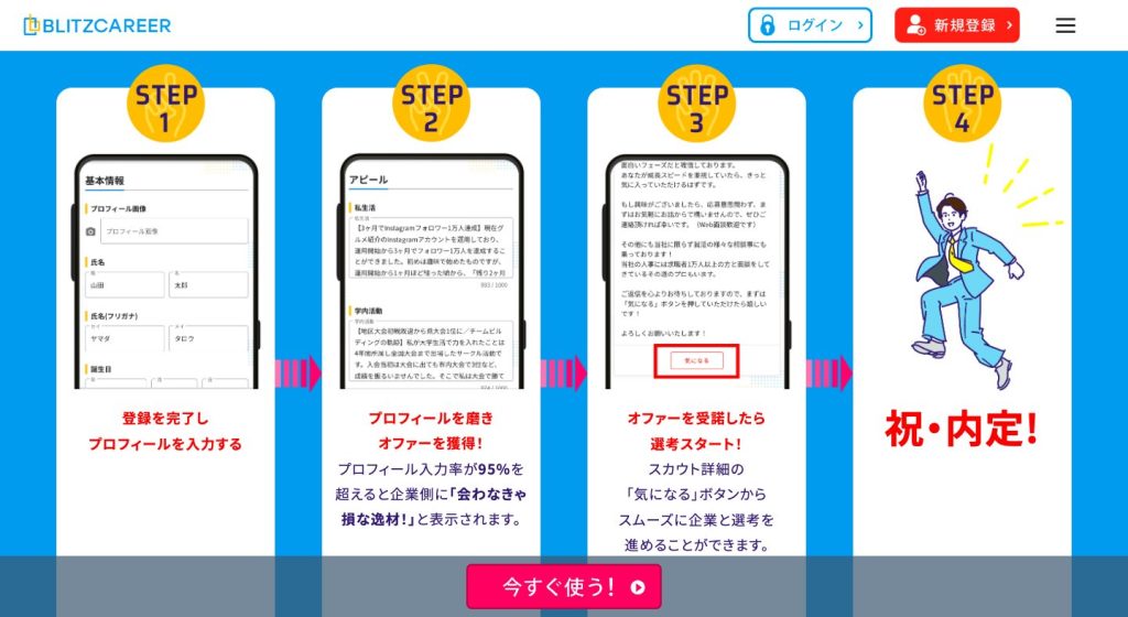 BLITZCAREERでは、ES・履歴書の提出なしでスカウトから選考に進むことができます。